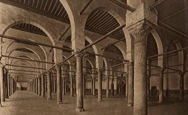 مسجد عمرو بن العاص بالفسطاط وهو أول مسجد أنشئ فى مصر وأنشأ بها سنة 21 هجرية = 642ميلادية مسجدا سمى باسمه وكان هذا المسجد غاية فى البساطة، فقد بلغت مساحته30 فى 50 ذراعا وبنيت حوائطه باللبن وفرشت أرضه بالحصى وصنع سقفه من الجريد واتخذت أعمدته من جذوع النخل ثم هدم عمر بن العاص مئات الكنائس لكى يبنى مسجدة والدليل على ذلك أن تيجان الأعمدة تحتوى على زخارف ورموز مسيحية قبطية ويمكن أن تعرف عدد الكنائس التى هدمت إذا أحصيت عدد الأعمدة وقسمتها على12 أو 6 لأن كل كنيسة المفروض ان يكون عدد أعمدتها 6 أو 12 وما تراه أيها القارئ هو جزء من جانب واحد من أربعة جوانب التى تكون جامع عمرو بن العاص