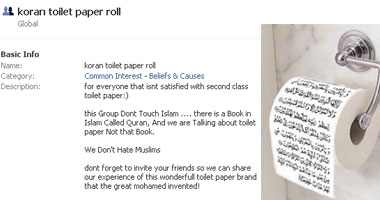 ألمانية تضع بوقاحة صورة من القرآن الكريم فى موضع ورق التواليت - سارة سند معركة كبيرة تدور رحاها الآن على الموقع الاجتماعى الشهير فيس بوك، بعد أن قامت ألمانية تدعى دينا ميلانى dena milany بإنشاء مجموعة على الفيس بوك باسم "Koran toilet paper roll" والذى يدعو إلى استخدام القرآن كورق مناديل فى دورات المياه، دينا تعلن بشكل صريح على الفيس بوك كرهها الشديد للإسلام، وعللت ذلك بأن المسلمين يريدون سرقة حرية أوروبا. ميلانى، مؤسسة المجموعة لم تكتف بذلك الهجوم،