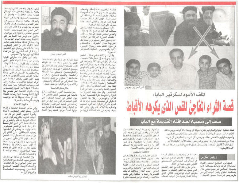 حيث قرر المجمع المقدس إعفاء البابا أو عزله وقامت جماعة الأمة بقيادة المحامى إبراهيم فهمى هلال بتنفيذ القرار ونقل البابا إلى دير مارجرجس للراهبات بمصر القديمة - وهو ما عرف إعلاميا بخطف البابا يوساب 1954 - واستمر الوضع من سيئ إلى أسوأ وظل البابا فى المستشفى القبطى حتى رحيله فى .1959 تأتى ذكرى ملك الآن مع الدور الضخم الذى يقوم به القس إنجيلوس إسحق سكرتير البابا تواضروس الثانى. الذى يمتلك ثقة رهيبة من البابا تجعله يتصرف بعجرفة ترجع لمكانته عند البابا الذى يغضب لأى شكوى ضده الأمر المحير للكثيرين فلماذا يتمسك البابا بهذا السكرتير الذى بالفعل يسبب مشاكل كثيرة له وللكنيسة. وقد صدر أكثر من مرة خبر إقالته نشرته الصحف ثم تم التراجع وتكذيب الأخبار؟ ∎ ملك وإنجيلوس القس أنجيلوس إسحق والشماس ملك، وجهان لعملة واحدة فى عصرين مختلفين، وكلاهما استقدم ليكون بجوار البابا البطريرك (البابا الـ115 الأنبا يوساب الثانى - والبابا تواضروس الثانى البابا الـ118) وكلاهما لم يأت للبابوية راهبا بل أسقفا؟ وهى نقطة خلافية، وهناك قوانين كنسية كثيرة قائمة ترفض رسامة الأسقف وتجعله بطريركا ومازال فكر هذه المدرسة سائدا، ولكن كلاهما كان أسقفا فى إيبارشية، الأول كان أسقفا مجلسا لإيبارشية جرجا، والثانى أسقفا عاما مساعدا على إيبارشية البحيرة؟ الأول استقدم شماسه ملك ليكون مساعدا له لأنه موضع ثقة ومحبة، والثانى استبقى تلميذه فى مدارس الأحد - تكشف الصورة المرفقة عن العلاقة القديمة بين القس إنجيلوس والبابا قبل دخولهما مجال الكهنوت - والمستقدم فى فترة القائم مقام ومطران البحيرة الأنبا باخوميوس، استبقاه السكرتير المعجزة. وكل من (الشماس ملك - القس إنجيلوس إسحق) عمل ظلا للبابا، يأمران بكل شىء وتنفذ أوامرهما فى الرسامات والتجريد وإدارة شئون الكنيسة، وآخر وقائع القس إنجيلوس التى تسجل للتاريخ حضوره آخر جلسة رسمية لأعضاء المجمع المقدس وكلاهما وقعا على قرارات مجمعية مع المطارنة والأساقفة، وكما كان ملك يمرر رسامة الأساقفة والكهنة وكل المشروعات، هكذا يفعل القس أنجيلوس إسحق. الذى أحضره الأنبا باخوميوس معه فى فترة القائمقام. ولم يكن بهذه الصورة من القوة والغطرسة نظرا للشخصية القوية للأنبا باخوميوس. ولكن بدأ التحول الحقيقى فى شخصيته عندما أدرك أنه قد أصبح سكرتير البابا. لقد أغره المنصب وأصابه بالخيلاء. فلم يكن يتخيل أنه سوف يصبح فى هذه المكانة قريبا من بابا الكرازة المرقسية بكل ما يعنيه هذا اللقب من معنى ولكن هذا هو الواقع الآن، فلماذا لايتكبر ويدخله الغرور فيغلق التليفون فى وجه الصحفيين والدبلوماسيين. ويشتكى منه الأساقفة والكهنة. والبابا لايسمع. والغريب عندما تكون الشكوى فى حضوره يضحك هذا السكرتير فى لامبالاة واستهتار. وكأنه يدرك أن البابا لن يفعل شيئا. ∎ الرسائل الغامضة من ناحية أخرى انهالت رسائل غامضة على صحفيى الملف القبطى كلها حول التغير فى النعمة الظاهرة على القس المعجزة والذى صار الكل فى الكل وخاصة فى تحديد المواعيد والمقابلات مع البابا. رسائل تتحدث عن هدايا منها سيارة أحدث موديل قدمها رجل أعمال قبطى معروف (عصمت ناثان) وساعات ذهبية ـ واجهته بمضمون هذه الرسائل فنفاها بنفس الغطرسة - واستمر فى استخدام النفوذ وازداد فى الثراء والتوغل. خاصة أن هناك مترددين على المقر البابوى يحملون هدايا وأظرف لايعرف لها حساب ولا كشف تبرعات. الأمر الذى أثار ضده بعض أعضاء المجمع المقدس وناقشوا الأمر مع البابا طالبين عدم فرض هذا السكرتير على الكنيسة بسبب علاقة البابا القديمة به. وخاصة أن هناك حالة غضب عامة شملت الأقباط ككل من القس إنجيلوس بعد اعتدائه على رهبان دير القديس أبومقار السكندرى.دون مراعاة لمكانتهم الروحية ولا أعمارهم. وكما كان يفعل ملك سكرتير البابا يوساب فى رسامة الكهنة هاهو القس إنجيلوس يتدخل فى رسامة الكهنة. حيث تمت رسامة قريب له فى آخر رسامات قام بها البابا تواضروس بالإسكندرية الأسبوع الماضى. وهذا الكاهن الق