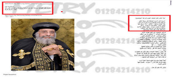 Home Up البابا اللي مانعرفوش | | السيدة التى طردها البابا هى الدكتورة سونيا وجيه | | البابا يبرهن على الهواء وشاهده الملايين لماذا ينتحر الاقباط اصحاب المشكلات ..البابا يامر بطرد سيدة فى اجتماعه العام بعد صراخها عندى مشكلة من سنة ونصف ومش عارفة اقابلك lمسيحو مصر 2014/11/26 كتبه : نور جورج رغم ان عاصفة كبرى قامت بعد انتحار القبطى اشرف صليب بالعاشر من رمضان وقبله القبطى الذى انتحر على لوحة الاعلانات بالصحراوى ,برهن البابا منذ قليل ..لماذا ينتحر الاقباط الذين يعانون من مشاكل ؟؟؟؟قام اتلبا تواضروس الثانى اثناء اجتماعه قبل قليل بطرد سيدة قبطية وقفت تناشده اثناء الاجتماع بان لديها مشكلة منذ سنة ونصف ولم تستطع مقابلته ولم تتمكن من دخول المقر البابوى بسبب الساتر الحديدى من العوائق والسكرتارية والمحيطيين بالبابا المؤسف ان اجتماع البابا مذاع على الهواء مباشرة ويشاهدة ملايين الاقباط فى مصر والعالم . كان البابا تواضروس الثانى قد منع اى مقابلات معه ورفض ان يسنمر فى لجنة البر لمساعدة الفقراء كما كان يفعل البابا شنودة والغى لجنة البر بالمقطم **** سيدة تقاطع البابا تواضروس فى بداية عظته الأسبوعية.. وعياد يرتل لحنًا كنسيًا للتغطية عليها ليتدخل الأمن بوابة الأهرام 26-11-2013 م أميرة هشام قاطعت سيدة تتشح بالسواد البابا تواضروس الثاني بابا الإسكندرية وبطريرك الكرازة المرقسية، في بداية عظته بالكاتدرائية المرقسية. وظلت السيدة تلوح بيديها وتشكو، وبدت أنها تحاول توجيه حديثها للبابا وهي تجلس في الصفوف الأولى على اليسار ولكن لم يتضح مما تشكو لصوتها الخفيض وسرعان ما قام مسئولو الأمن بإخراجها خارج القاعة. قام المرتل إبراهيم عياد بترتيل لحن كنسي للتغطية عليها واستأنف البابا عظته من جديد والتي جاءت تحت عنوان "القديسون". البابا تواضروس بعد طرد إحدى السيدات من العظة: كسرت مهابة الكنيسة فيتو الأربعاء 26/نوفمبر/2014 م - ريمون ناجي قال البابا تواضروس الثانى بابا الإسكندرية وبطريرك الكرازة المرقسية، معلقا على السيدة التي ظلت تصرخ في مقتبل العظة: إن السيدة استخدمت أسلوبًا غير مناسب، وكسرت مهابة الكنيسة. وأضاف البابا خلال عظته الأسبوعية بالكاتدرائية المرقسية بالعباسية، أن السيدة أخفت حقائق في مشكلتها وتعاملت بأسلوب لا يرقى بمكان الكنيسة وأدخلته داخلها، وهو ما يمثل خطية تحاسب عليها مما يسيء لصورة الكنيسة. يذكر أن إحدى السيدات الحاضرات بالكاتدرائية، قاطعت البابا تواضروس الثاني بابا الإسكندرية وبطريرك الكرازة المرقسية، في مقتبل عظته الأسبوعية، محاولة إيصال مشكلة خاصة بها. وراحت تصرخ بصوت عالٍ: "عندي مشكلة بقالها سنة ونص، ومفيش حل لحد دلوقتي". وتدخلت السيدات الحضور لتهدئتها ولكنها تزايدت في الصراخ، وقابلها البابا بالنظر في صمت، ولكنها لم تكف، فأمر بإخراجها من العظة بالكنيسة الكبرى بالكاتدرائية. | بالصورة : رسالة نصية من البابا لاحد مصوريه فى الاسكندرية .. " نعم" السيدة التى طردتها من الاجتماع زوجة كاهن" وقابلتها مرات ومرات وهى مريضة نفسية ؟؟وتتهم زوجها بسرقة مليون جنيه؟ ومسيحيو مصربعد انهاماته للسيدة .5تسال أسئلة محرجة مسيحو مصر 2014/11/29 كتبه : سمير منصور نشر أحد مصورى البابا تواضروس بالاسكندرية ويدعى ماركو مترى , رسالة تليفونية نصية ارسله له البابا تواضروس الثانى .. يعترف فيها أن , السيدة التى قام بطردها من اجتماع الاربعاء ,يعرفها ولم يفاجئ بها وقابلها مرات ومرات ؟؟؟ و هى زوجة كاهن كما نشرت مسيحيو مصر ظهر اليوم , وأعترف ان لها مشكلة منذ خمس سنوات , ويعرفها , واتهمها انها مريضة نفسية ؟؟؟وازاد انها ترفض تلقى العلاج , وأعترف ان اسقف الايبارشية التى ينتسب اليه القسيس يعرف كل حاجة وأن الزوجة تتهم زوجها بسرقة مليون جنيه ؟؟؟ وننشر نص الرد الذى لم ينشره البابا فى الكرازة لسان حال الكنيسة , او على صفحته المسماه المتحدث الرسمى للكنيسة , ورد البابا الذى نرفق صورة منه باعلى الخبر .. نصه كالاتى السيدة التي اثارت المشكلة ف