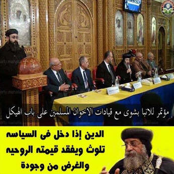 عنوان الخبر: وفد من الكنيسة يلتقي قيادات في جماعة الإخوان المسلمين وحزب الحرية والعدالة بالزاوية، الكاهن يقول يجب أن نتكاتف لمحاربة النظام القديم (الذي نال مباركة البطريرك والأساقفة وقتما كان الحاكم!!)
