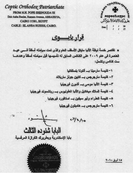 وما أن تبنت مسيحو مصر شكو قبطى لانعرفه يدافع عن أسقفه المجلس أسقفا على " فرجينيا وماحولها , بحسب نطق الروح القدس
